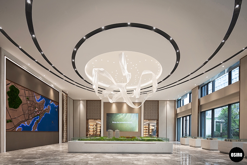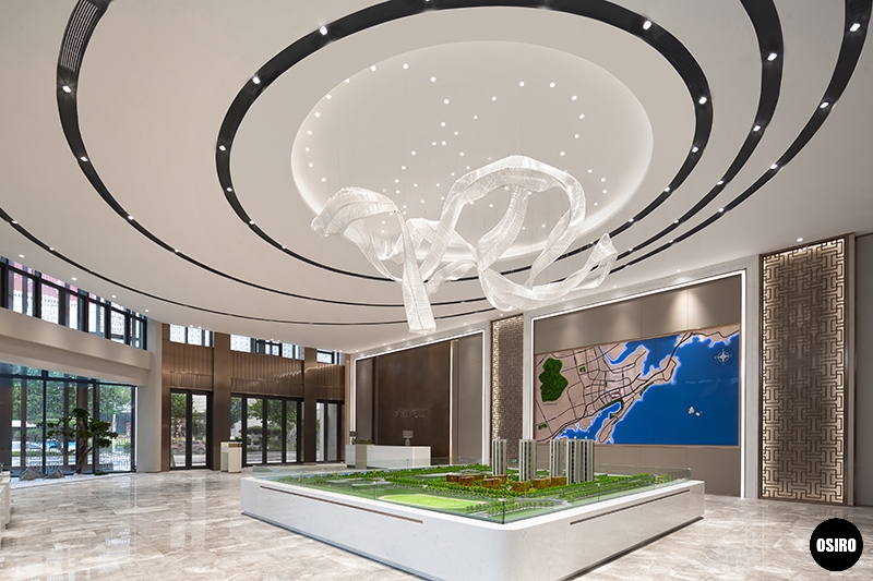 圆形的展示区宏伟端庄、气势恢弘,上方的吊灯设计灵感来源于涌动的海浪,居当临水,有水则灵,