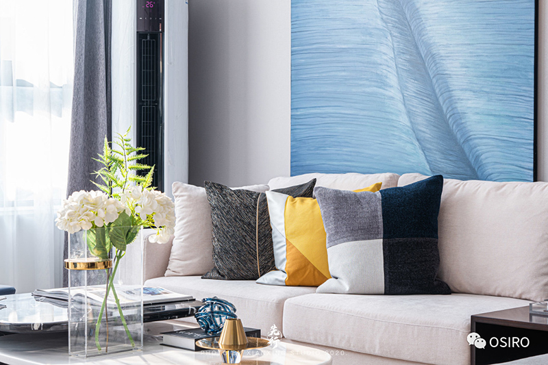 青岛买手店在家具的选款上简洁大方,在色彩上进行低明饱和度的对比。大胆的采用 大色块的装饰画,在场景营造的细节上进行巧妙地处理,增加了整体的丰富度及精致度。