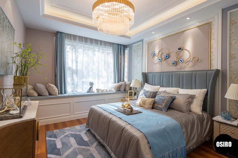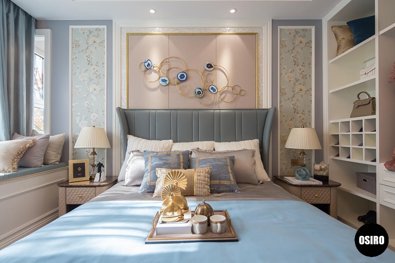 主卧的配饰灵感,青岛空间设计静谧蓝、金色、黄色不间断地跃入眼帘,摩登又不失温馨。
