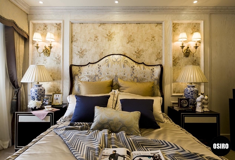 以本案为例,青岛室内设计师大量使用水晶灯、金线、铁艺、墙布、花线、