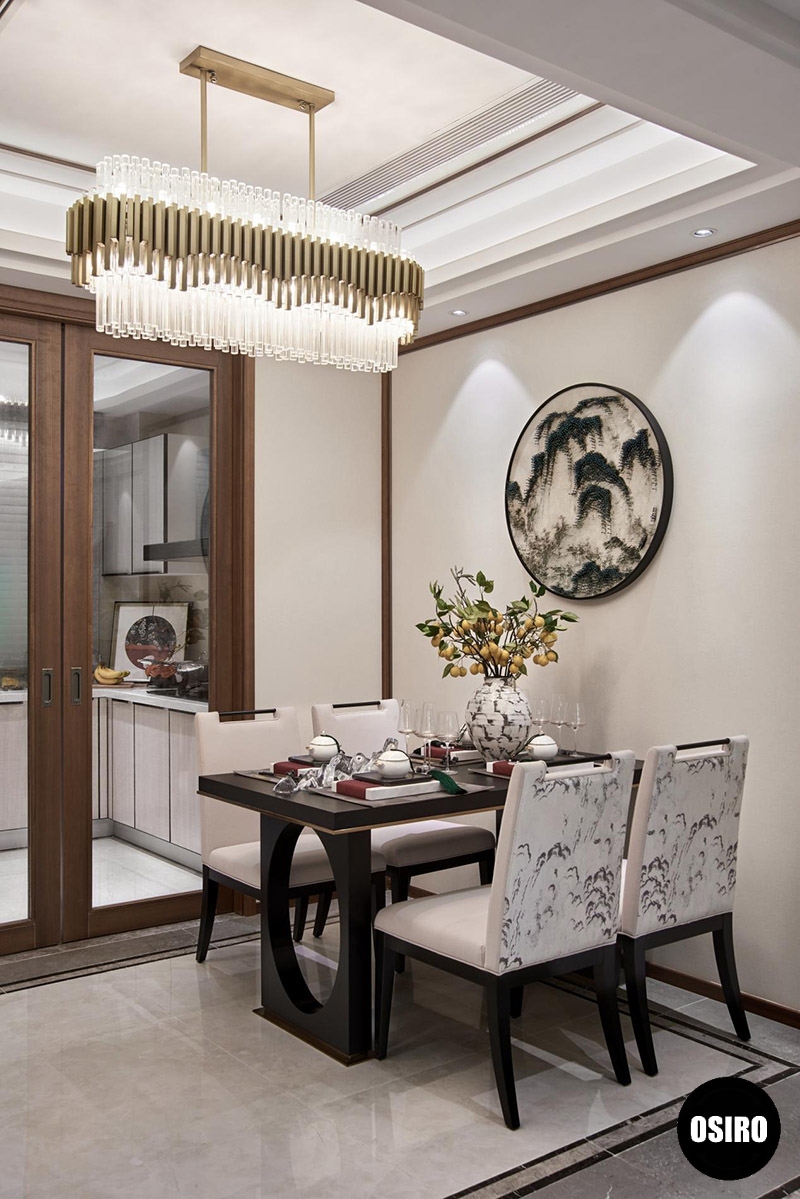 中式的水墨元素在椅子背上印染而来,搭配直角分明硬朗的餐桌,相得益彰。