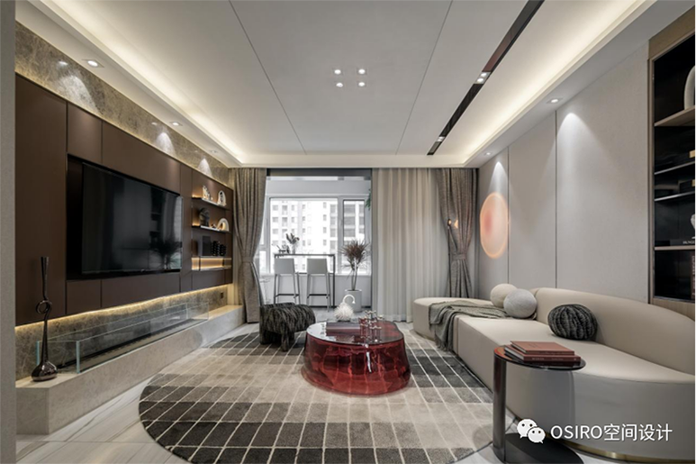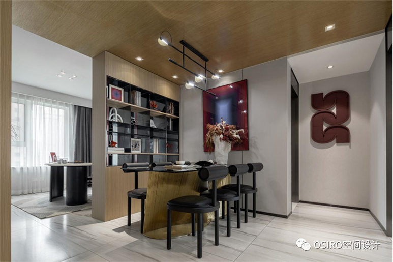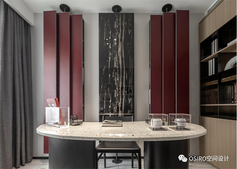 本案软装巧妙运用:高光、撞色等设计手法,使明艳的红、经典黑白色调在空间中交织碰撞,犹如纯粹灵动的弗拉门戈舞步,在跃动中散发着神秘灼人的魅力,在变幻的空间中演绎主人的故事,令人沉浸在空间多情浪漫的艺术氛围中。