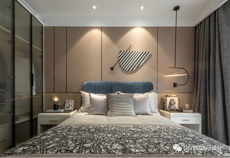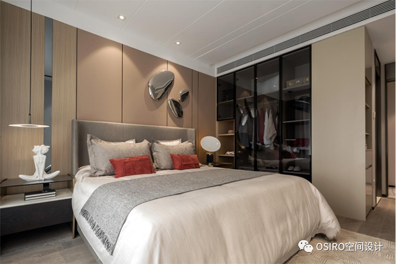 主卧,不仅仅是单纯的视觉体验,更关乎生活方式的探索和追求。整体空间流淌着静谧又高贵的气息。皮革硬包的温润加持搭配意大利经典品牌双人床,美感与实用并存,床头背景的壁饰打破常规,优雅且具有格调。