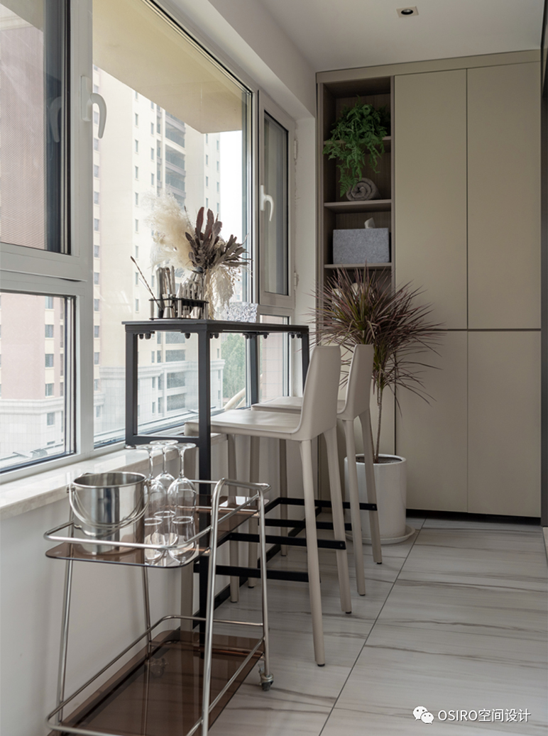 阳台空间,时光就是最动人的艺术,金色的阳光透过落地玻璃窗撒入室内,绿植细长的茎叶随微风浮动,光影疏斜间,品一杯酒,享受岁月静好。