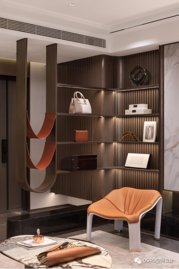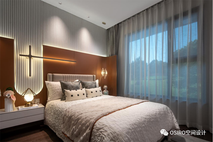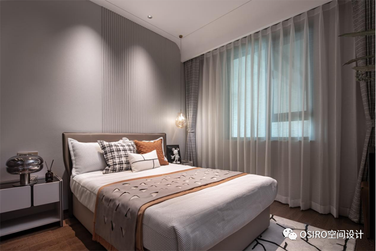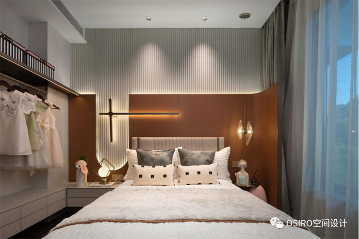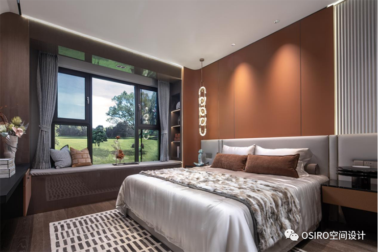 主卧兼具飘窗、衣帽间、化妆间、卫生间一体的全功能型卧室。延续了优雅橙、暖棕的色彩语言,搭配时尚的装饰画与艺术