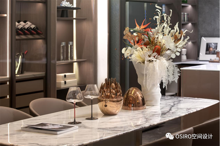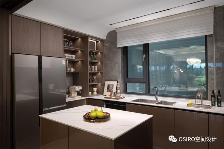 厨房以独立导台加餐厅融合的概念,构成环形动线,家人不仅可以在此备餐、品尝美食、小酌畅饮,亦可在此交流互动,成为情感连接的地方。
