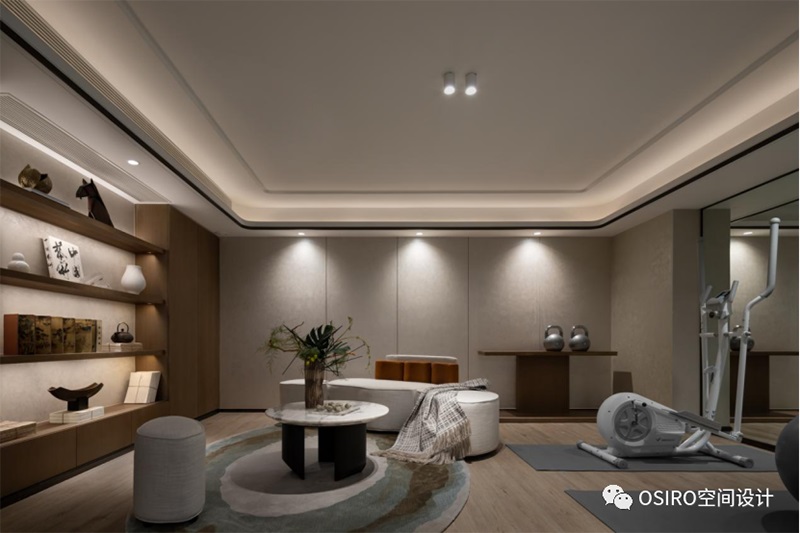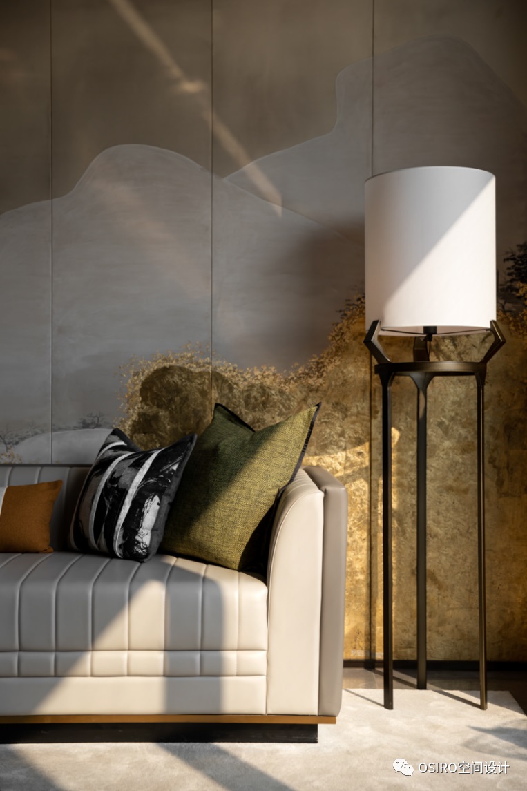 地毯,呼应背景墙的山水壁画,线条与朦胧的意象玩味出古代文人心中的禅意美。卧谷听松,主人的情怀亦在此处呈现。
