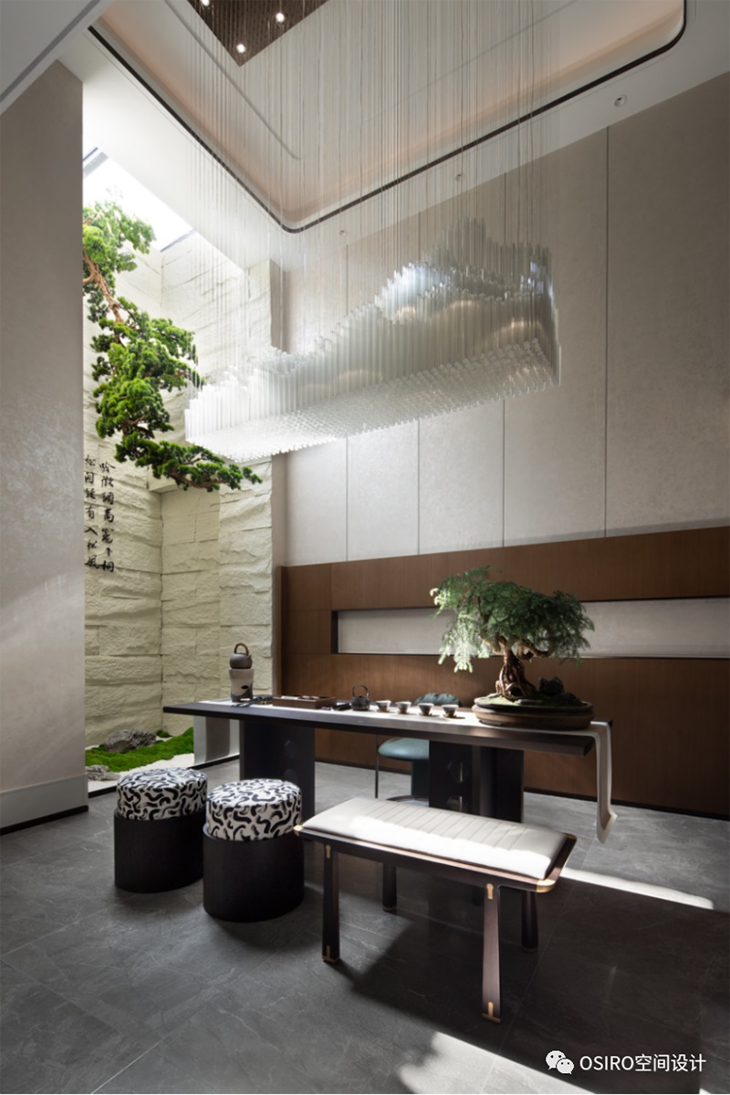 门外是人间烟火,门内是闲逸雅致。茶区以听琴图为为灵感,直接入眼的是苍劲有力,自上而下的迎客松,一方茶席二三茶具,宁静致远,燃一线香沏一壶茶,不经意间刻画出的东方生活美学。